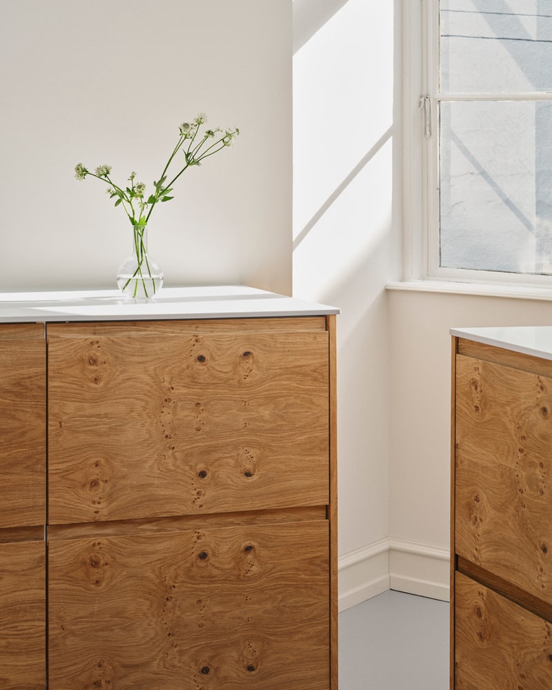 Lys eg med rolig sortering og lodret åretegning, ideel til et tidløst, minimalistisk køkken.