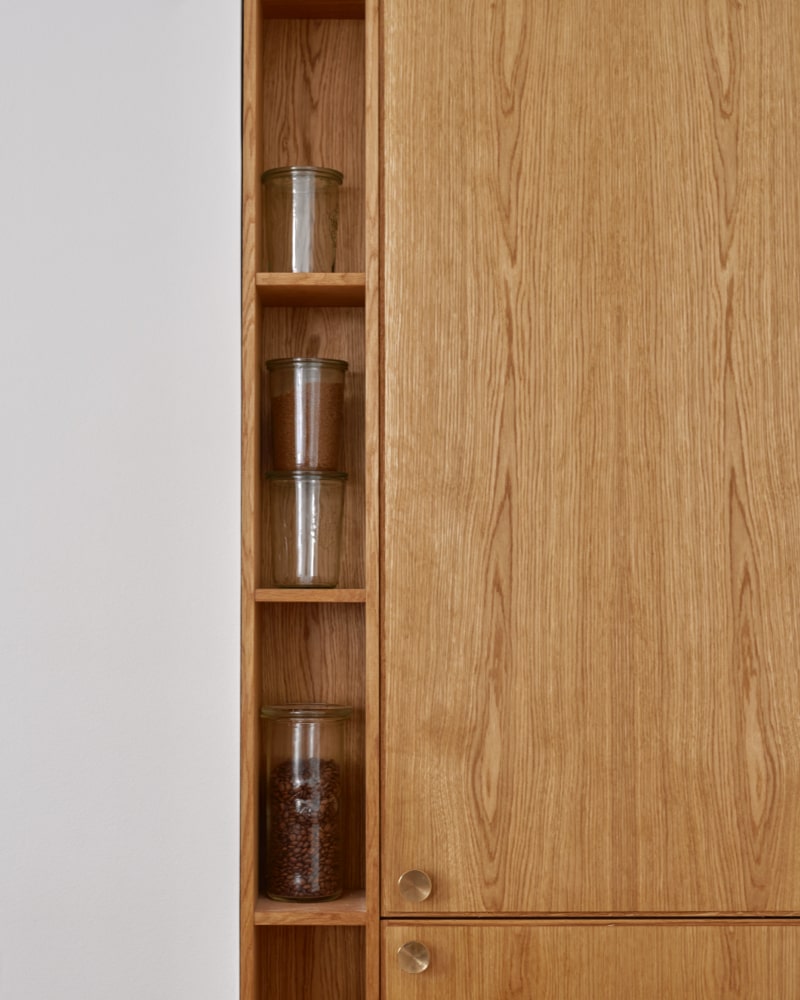 Når man vælger et egetræskøkken fra Arki Studio, handler det ikke kun om materialet, men om helheden og de små snedkerdetaljer, der gør forskellen i hverdagen. Mange vælger grebsløse fronter i eg for at få et roligt, moderne udtryk, mens andre foretrækker de klassiske fræsede fingergrip, der giver et diskret, men markant greb. Vi kan skabe lette vitriner i egetræ, åbne hylder eller højskabsvægge, der får køkkenet til at føles som en indbygget del af boligen.