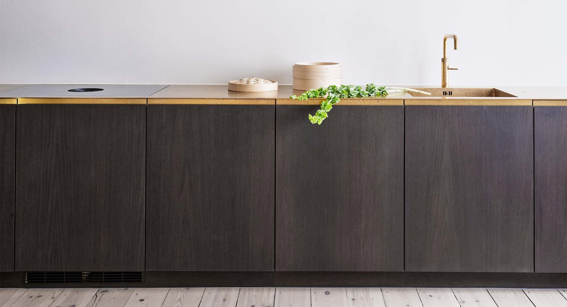 Eg passer smukt sammen med bordplader i natursten, stål eller messing og fungerer i både moderne og klassiske køkkener.